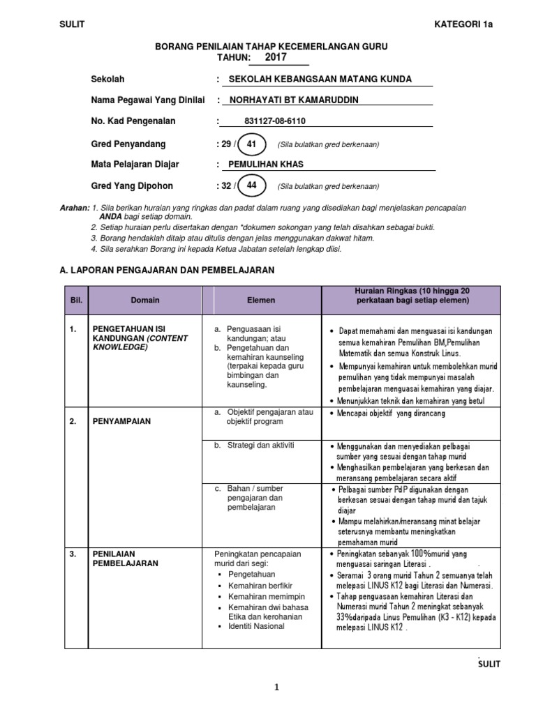 Doc Borang Penilaian Tahap Kecemerlangan Guru Borang Kategori 1b Guru Nor Asmah Awang Academia Edu