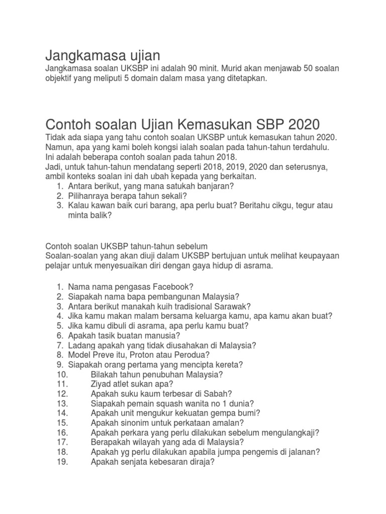 Semakan Uksbp 2020 Online Contoh Soalan Ujian Kemasukan Sbp
