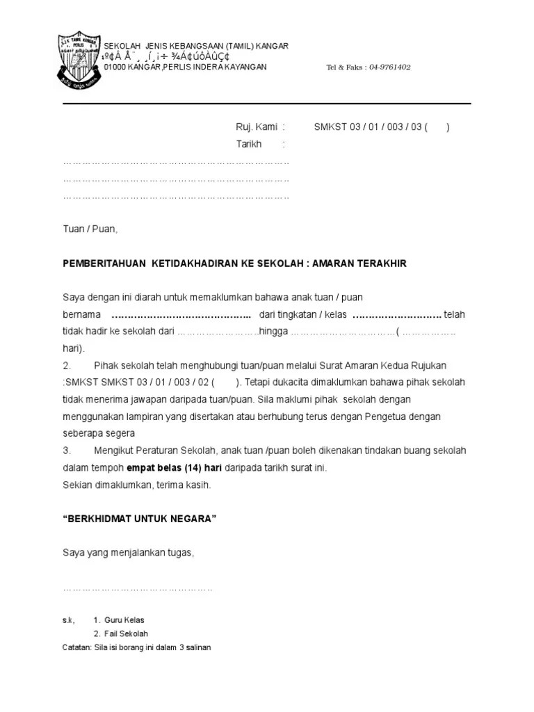 Contoh Surat Amaran Ponteng Sekolah