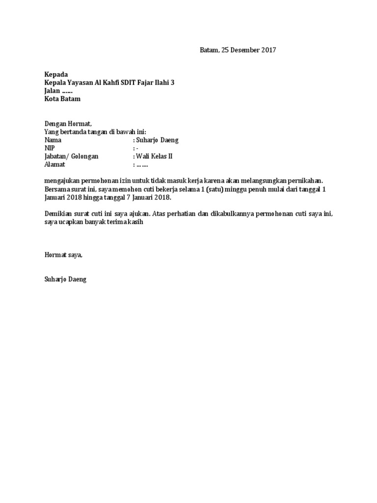 Surat Permohonan Cuti Menikah Guru Resepi Book B