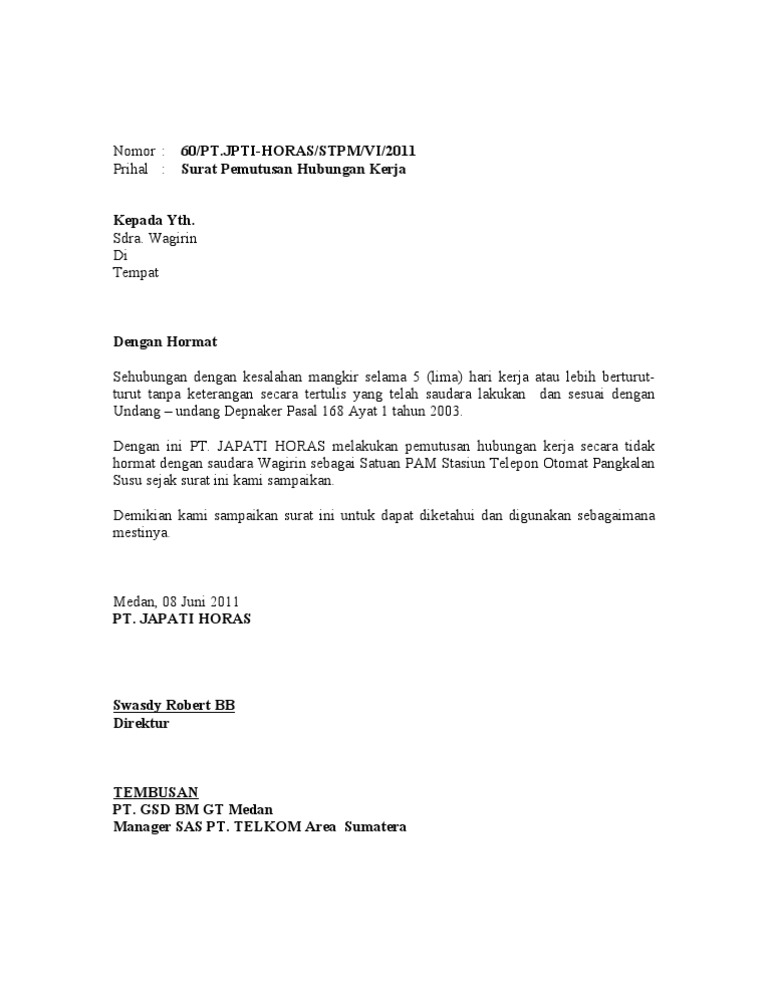 30 Contoh Surat Pemutusan Hubungan Kerja Phk Dengan Berbagai Alasan