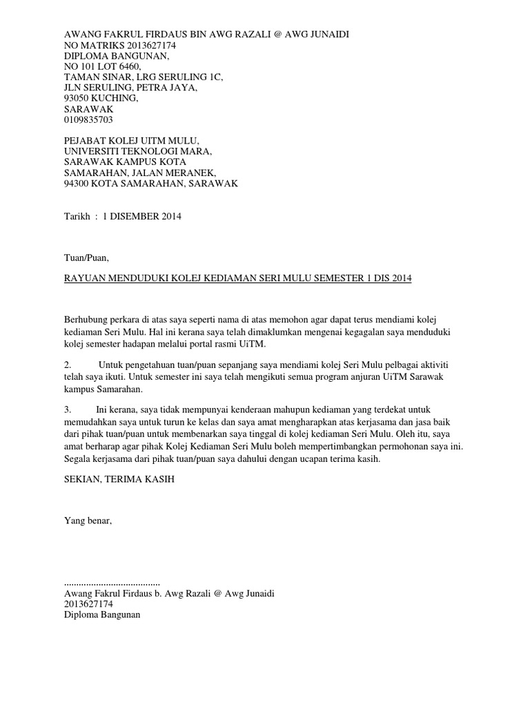 Unit kolej zon a universiti teknologi mara jalan lendu 78000 alor gajah melaka. Contoh surat rayuan penginapan kolej ktac contoh surat rayuan penginapan murah contoh surat rayuan penginapan di contoh surat rayuan penginapan dekat contoh surat rayuan haji contoh surat rayuan pertukaran contoh surat rayuan pengurangan bayaran contoh surat rayuan matrikulasi contoh surat rayuan ke universiti contoh surat rayuan kemasukan sekolah contoh surat rayuan asrama contoh. Surat rayuan penginapan kolej surat rayuan jpa surat rayuan asrama surat rayuan biasiswa surat rayuan kuarters surat rayuan haji 2019 surat rayuan surat rayuan in english surat rayuan jpj surat rayuan haji surat rayuan tnb surat rayuan akpk surat rayuan kwsp.
