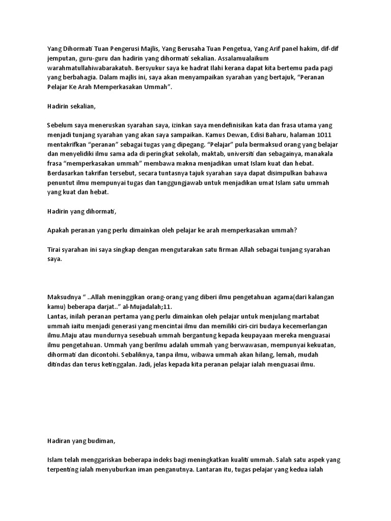 Aina nazira february 19 2013 at 5 37 am. Ini adalah contoh syarahan yang pernah di berikan kepada saya. Terima kasih saudara saudari pengacara majlis yang saya hormati barisan hakim yang arif lagi bijaksana penjaga masa yang setia dengan jam randiknya rakan rakan seperjuangan dan seterusnya hadirin hadirat sekalian.
