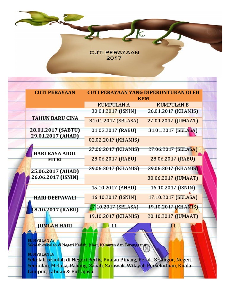 Cuti Perayaan 2017 Kumpulan A Sekolah Sekolah Di Negeri Kedah Johor Kelantan Dan Terengganu Kumpulan B