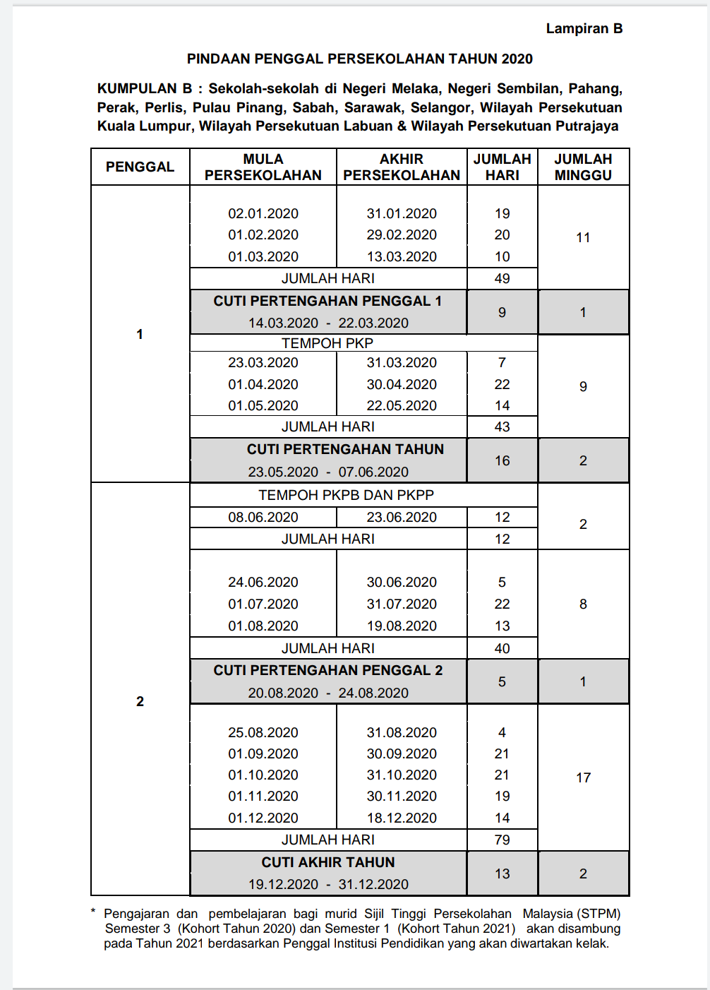 Kpm Takwim Persekolahan Pindaan Penggal Persekolahan 2020