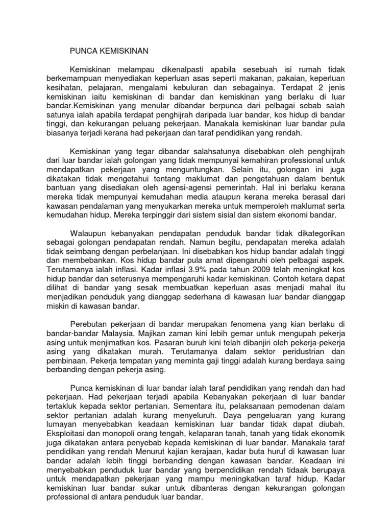 Secara umumnya kemiskinan ialah satu keadaan di mana seseorang itu kekurangan bahan bahan keperluan hidup. Ini bermakna cuma 0 4 peratus isi rumah di malaysia yang masih dibelenggu kemiskinan dari segi menyediaka n keperluan asas makanan perlindung an dan pakaian. 1965 yang menulis lebih kurang 40 than selepas za ba.