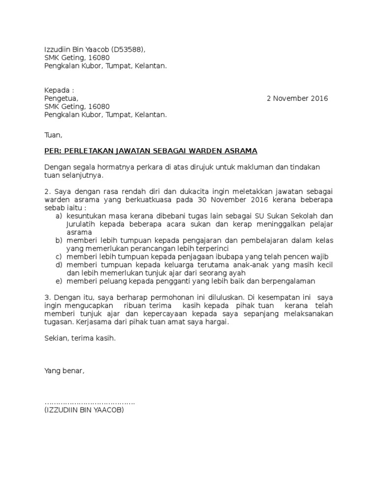 Contoh Surat Berhenti Kerja Surat Perletakan Jawatan
